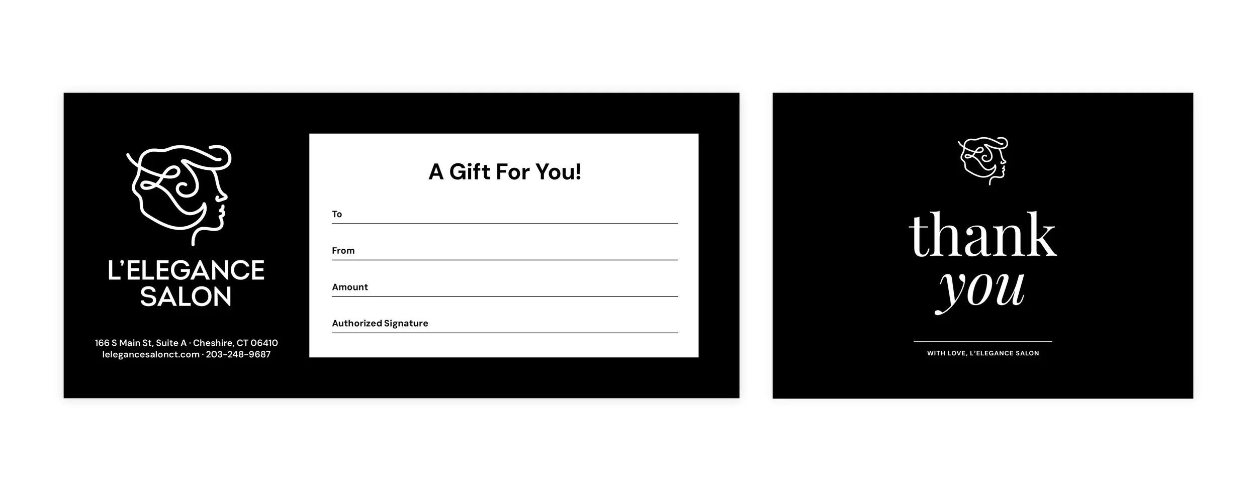 Branded gift certificates and thank you cards were designed to extend the salon experience beyond the appointment. These pieces reinforce the brand’s elevated aesthetic while creating a thoughtful, personal touch for gifting and client appreciation.