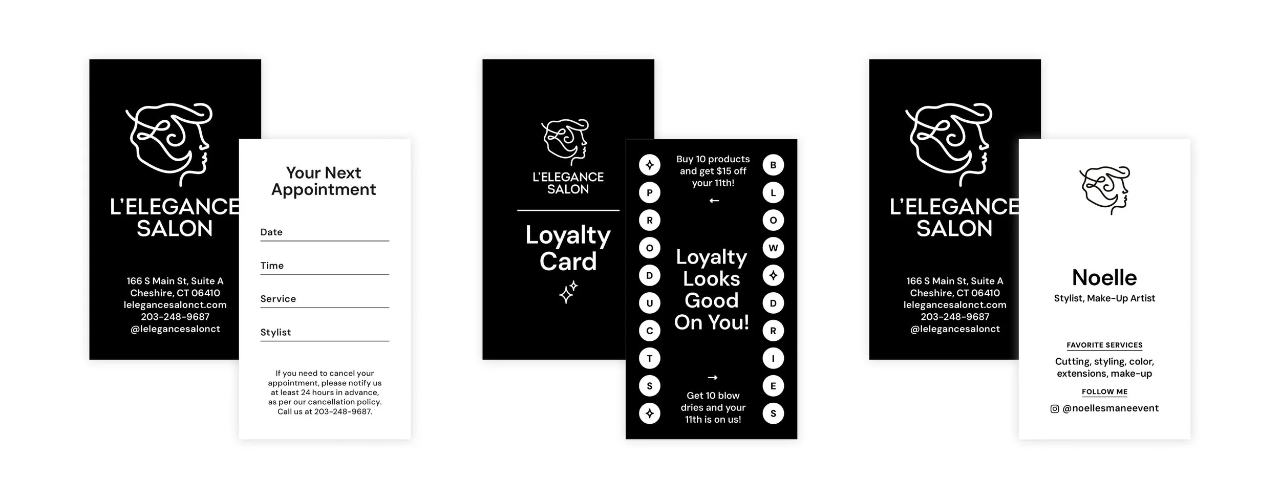 A suite of thoughtfully designed cards supports the salon’s daily operations—from appointment and loyalty punch cards to individual stylist cards that promote each stylist’s Instagram presence and signature services.